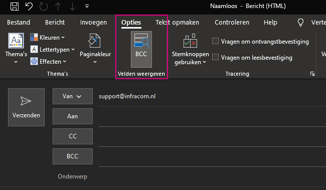 Het veld BCC (blind carbon copy) is in Microsoft Outlook standaard verborgen. Je kan het veld gemakkelijk zichtbaar maken.